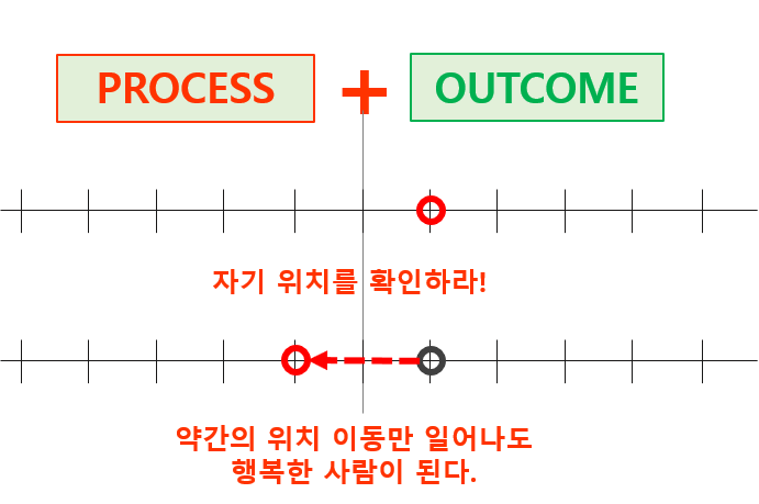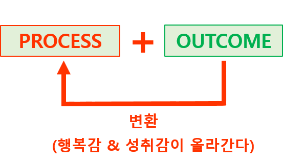 그러나 Process를 목적으로 삼는 경우 그 과정 중 얻은 도전과 성취감 등 얻은 보물을 생각하여 행복감이 높아질 수 있다.